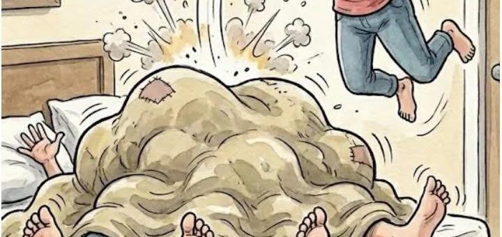 Wife comes home late at night and quietly opens the door to her bedroom. From under the blanket she notices four legs instead of two! She reaches for a baseball bat and starts hitting...